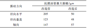 改進(jìn)后GV3在0~56%開度(此時(shí)機(jī)組已達(dá)滿負(fù)荷)下振動(dòng)值基本保持穩(wěn)定,高噪聲現(xiàn)象消除。更換閥芯前后GV3閥桿處振動(dòng)實(shí)測結(jié)果如圖5所示,抗燃油管最大振幅見表2。改進(jìn)后閥芯流量特性有所變化,但依靠DEH的自動(dòng)調(diào)節(jié)性能可完全正常運(yùn)行。經(jīng)過一年多的運(yùn)行,2號(hào)汽輪機(jī)GV運(yùn)行穩(wěn)定,其后對(duì)1號(hào)汽輪機(jī)GV3也進(jìn)行了改造。