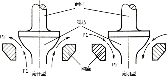 用在壓力高、壓差大場合的氣動調節閥,閥桿處很容易泄漏,更換填料或壓緊填料壓蓋后,用不了多長時間又出現泄漏,應核實調節閥的流向,“流閉型”介質是從閥芯的大端往小端流動,“流開型”介質是從閥芯的小端往大端流動。“流閉型”的可改為“流開型”來提高閥桿密封效果。該方法實際就是把閥芯前后壓力P1和P2對換,當P2處于閥桿端時,閥桿的密封性好。如圖10-4所示。